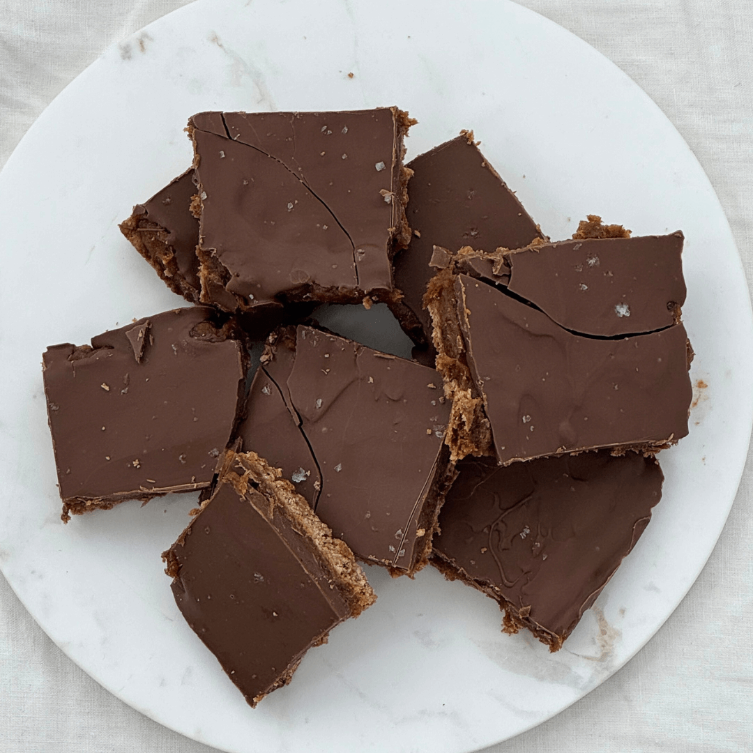 We’ve swapped out the traditional caramel for a naturally sweet and sticky date layer, and the rich chocolate topping is made with our No Added Sugar Milk Choc Buttons. It’s indulgent without the overload.