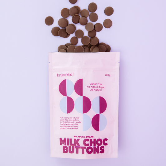 • 40g Krumbled Foods No Added Sugar Milk Chocolate Buttons, melted