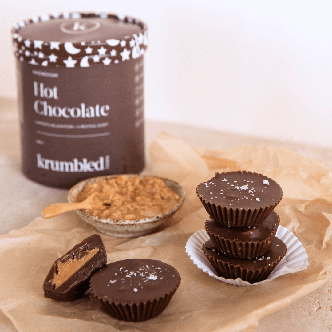 *12 peanut butter cups provide the equivalent of one serve of Krumbled Foods Magnesium Hot Chocolate.