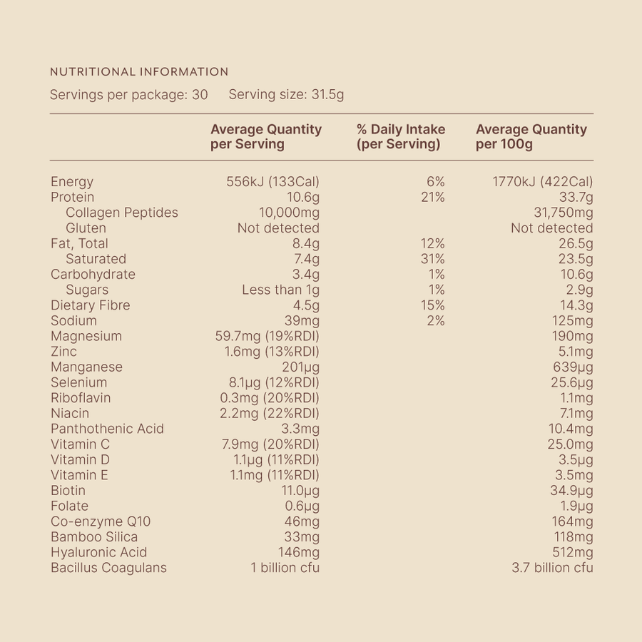 Grass Fed Bovine Collagen Peptides (35%), Coconut Milk Powder, Prebiotic Tapioca Fibre, Erythritol, Cocoa Powder, Vitamin & Mineral Skin Optimix [Hyaluronic Acid, Minerals (Manganese, Magnesium, Bamboo Silica, Zinc, Selenium), Vitamins (Co Enzyme Q10, Vitamin C, Pantothenic Acid, Niacin, Vitamin E, Riboflavin, Biotin, Vitamin D, Folic Acid)], Digestive Enzyme Blend (Amylase, Protease, Cellulase, Lactase, Lipase), Natural Flavours, Vegetable Gum (Xanthan Gum), Probiotics (Bacillus Coagulans)
