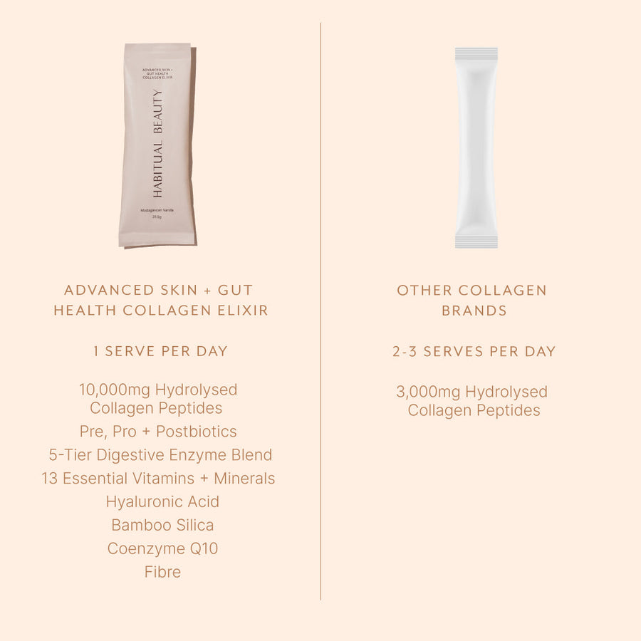 After many years of formulation with Australia's leading experts, our Collagen Elixir offers a clinically proven dose of 10,000mg Collagen Peptides along with 24 other bioactive vitamins and minerals to fast track results in as little as 3 weeks. We are a comprehensive all in one beauty and gut health supplement.