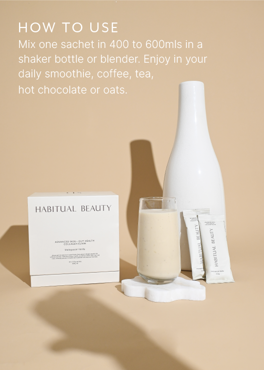 Mix one sachet into your morning coffee, tea, hot chocolate, smoothie, or in a shaker with cold water/milk of choice. Use at least 600ml of liquid if room temperate, 400ml if warm/hot. We also love to put our Collagen Elixir into porridge, chia pudding and baked goods.