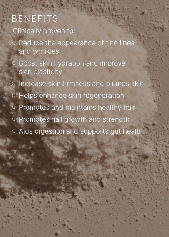 An innovative blend of clinically proven ingredients that have been carefully selected to enhance skin radiance, nail and hair strength, support gut health and overall wellness from within.