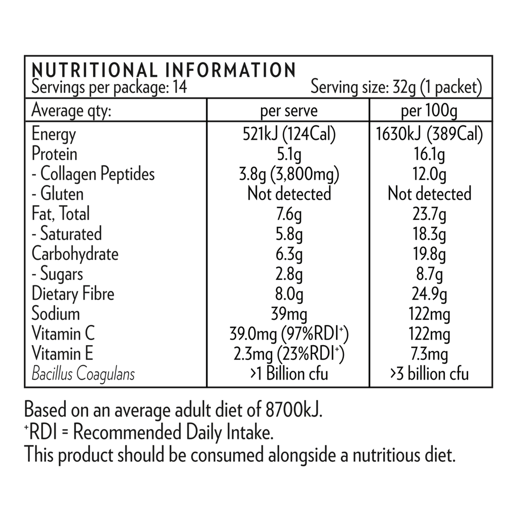 Each Beauty Bites® contains 5 hero anti-ageing and gut health ingredients: - 3,800mg of pure Hydrolysed Collagen Peptides I & III from grass-fed, pasture raised bovine to support glowing skin, stronger hair and nails - 8g of added prebiotic fibre per serve to nourish good bacteria and encourage a glow from within - 1 Billion CFUs of Bacillus coagulans for effective relief of stomach distress - Vitamin E and C to enhance skin hydration, elasticity and protection